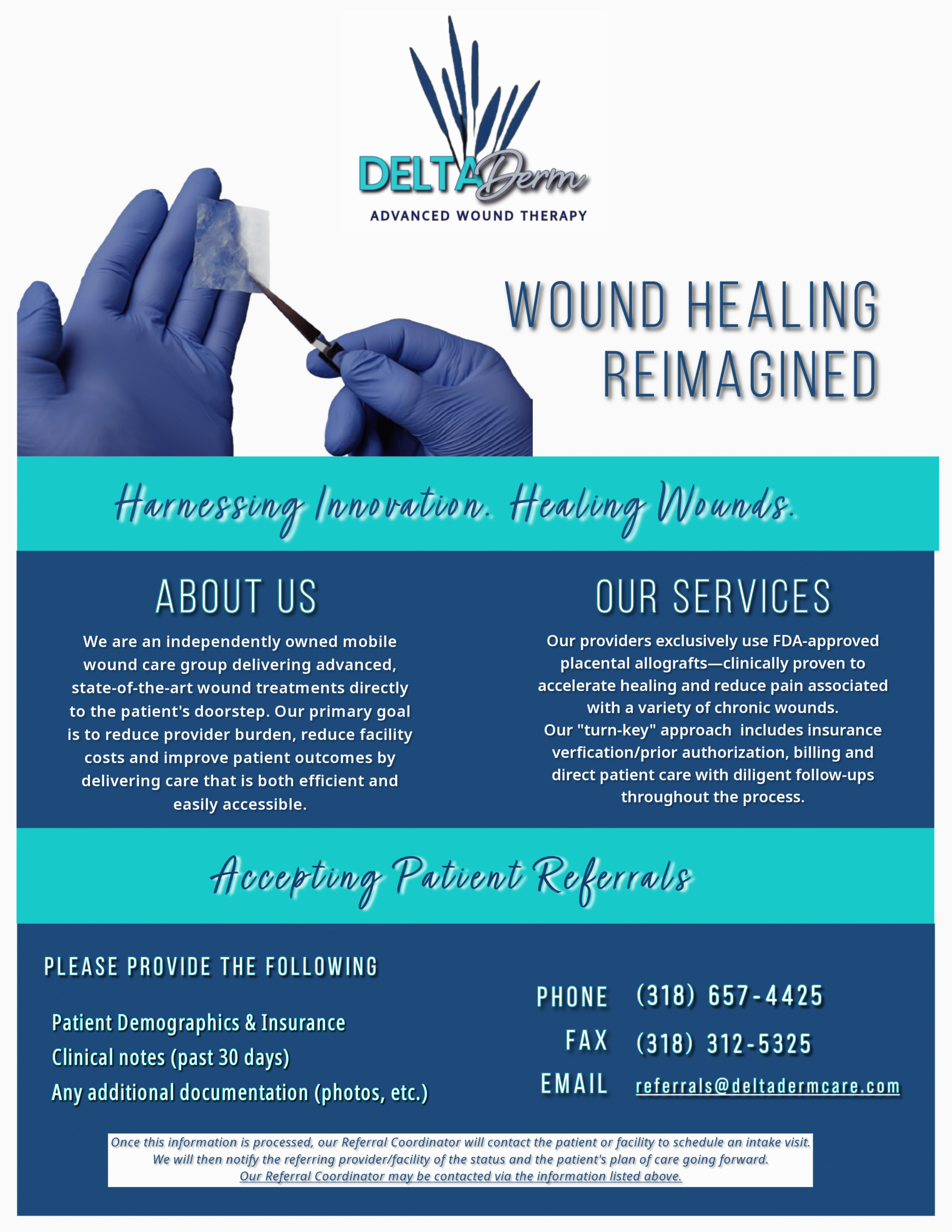 Unlike traditional wound care, which often focuses on basic cleaning and dressing changes, our approach uses advanced placental grafts that provide natural growth factors and a protective barrier to actively support healing. These grafts help the body repair both chronic and surgical wounds more effectively, reducing complications and speeding recovery. Combined with care from wound-certified providers and the ability to deliver services wherever the patient is—home, rehab, nursing facility, or hospital—our program offers a higher level of personalized, proactive wound management.